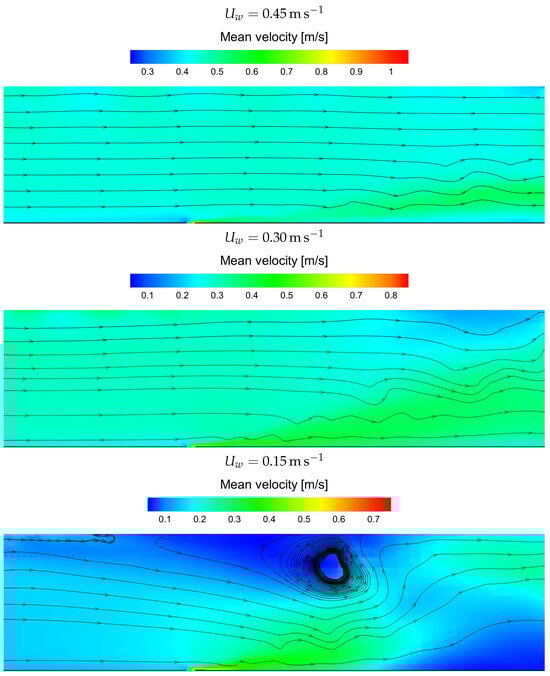 In Figure 3, the contour of the mean velocity magnitude is shown. Note the distinct flow behavior between each of the cases. For the slowest flow velocity, a vortex forms close to the surface on the downstream side of the bubble curtain device. In this case, the ratio allows the generation of a strong enough uplifting current to drive the particles to the surface. In contrast, as flow velocity increases, the vortex is suppressed and the effect of the uplifting current becomes increasingly weaker. As such, determining the right ratio is a critical task in order to increase the device’s efficiency in retaining microplastic particles.