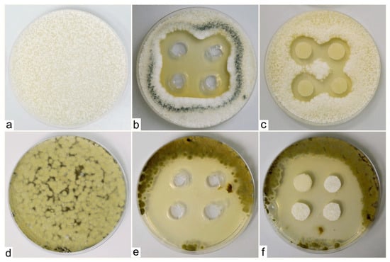 Zones around the applied solution (M-decanocide) for the species Aspergillus clavatus (control sample—(a), to wells in the agar medium—(b), on sterile filter paper targets with a diameter of 1 cm—(c)) and Cladosporium cladosporioides (control sample—(d), to wells in agar medium—(e), on sterile filter paper targets with a diameter of 1 cm—(f)).