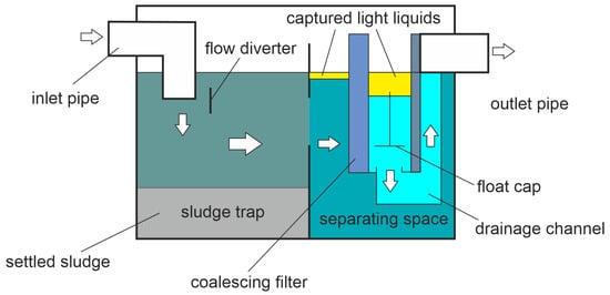 According to the CSN EN 858-1 standard [11], a light liquid separator can be defined as a device used for the treatment of industrial wastewater or rainwater containing light liquids that are not emulsified. These are liquids with a density lower than or equal to 0.95 g/cm3 (e.g., petroleum substances). These may be present in wastewater from vehicle parking areas, garages, refuelling points, car wash boxes or industrial plants. The separator prevents such polluted water from entering the receiving stream or sewer network.