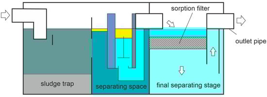 Compared to the above-mentioned type, the separator is equipped with the so-called final separating stage. A sorption filter filled with sorbent (e.g., Fibroil) is fitted here. It is used to capture the residual amount of light liquids that have not been separated in the separating space. It is used in particular when the quality requirements for the runoff water are increased—it guarantees a concentration of light liquids at an outflow of 0.2 to 0.5 mg/L. The treated water flows into the outlet pipe (see Figure 2).