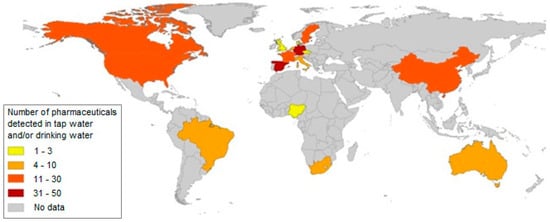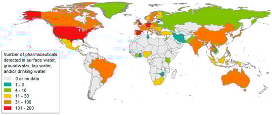 On the basis of many published works, including monitoring and studies that dealt with the issue of drugs and their metabolites in water, it has been found that the pollution of water, whether surface, underground or, to a lesser extent, drinking water, by these micropollutants is a worldwide problem. Based on the study of the currently available literature, comprising more than 1000 works, a database was made, which showed that drugs or their transformation products were detected in the environment of 71 countries covering all continents [].