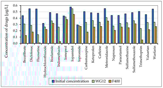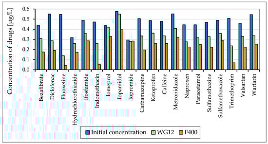 Concentration of drugs (µg/L) before and after 60 min adsorption with WG12 and F400 at the pH value 6.5.