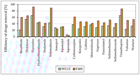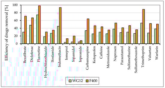 The efficiency of drug removal (in %) before and after 60 min adsorption with WG12 and F400 at the pH value 7.8.