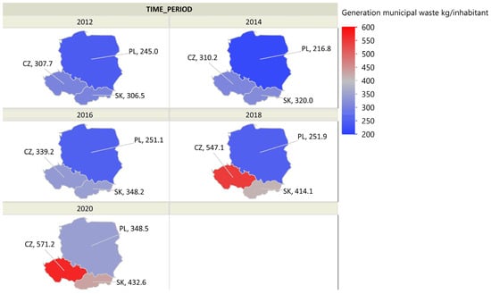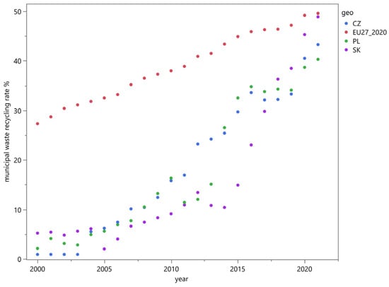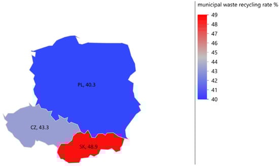 In Figure 4, we can see that the recycling rate is lowest in Poland, followed by the Czech Republic, and the highest recycling rate is in the Slovak Republic. Countries have to follow different protocols and documents. Slovakia must observe EU documents and recommendations to meet their environmental policy, such as the “Slovakian Waste Economy Program in 2021–2025” and the “Slovakian Program for waste avoiding in 2019–2025” [23]. The goal is to increase waste recovery with repeated use and recycling and support the minimizing of waste. The mentioned programs result from the decree of the European parliament and European council 2008/98/ES about waste and the EU Action Plan for a circular economy [24,25]. Part of the CE action plan is elaborated in the frame decree of waste; No 2018/851 (Year 2021) [26].