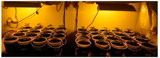 The plants of Solanum lycopersicum were grown in special boxes (Figure 1) equipped with aluminum foil preventing temperature changes and the influence of results by external sources of heat or cold in the laboratory (radiators and windows). The temperature in boxes was 24 °C (day) and 18 °C (night) throughout the growing season. Sodium lamps of a power of approx. 10,500 Lx were used as a source of light and partly heat. Each plant was planted in 5L containers. Fertilizer was applied 5 times in total during the vegetation period, at intervals, in the 2nd, 6th, 8th, and 10th week. In the cases where irrigation with fertilizer was not applied, control demineralized water was used instead. The time interval since planting the plants to their harvest was, in total, 13 weeks for above-ground biomass and 14 weeks for underground biomass root. Fruits were harvested in a total of 4 phases, namely, in the 9th, 10th, and 13th week.