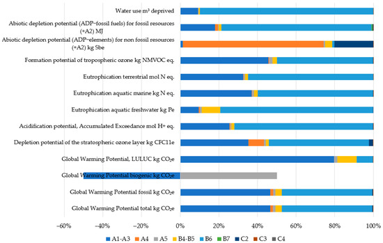 Figure 1, Figure 2 and Figure 3 present results for environmental impact indicators according to EN 15978 and EN 15804+A2. They present the percentage share of life cycle stages on the environmental impact indicators for three scenarios of EoL.