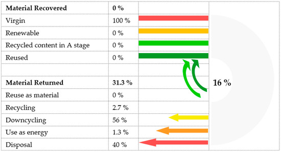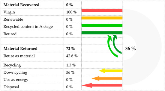 Figure 5, Figure 6 and Figure 7 present the results of roof structure circularity for three scenarios of end-of-life. The highest circularity score is 36% for scenario 3, followed by scenario 2 with a percentage of 16%, and the lowest is 2% for scenario 1. Roof composition consists of virgin materials (100%). There are no renewable or reused materials in the composition. Scenarios 2 and 3 present scenarios according to which 56% of materials could be downcycled (56%) and recycled in percentages of 2.7% and 1.3%, respectively. According to scenario 1, 2.8% of materials could be used as energy and up to 94.5% put into landfill. Scenario 2 presents a scenario according to which 1.3% of materials could be used as energy and 40% put into landfill. And finally, according to scenario 3, 42.6% of materials could be reused and 0% landfilled.