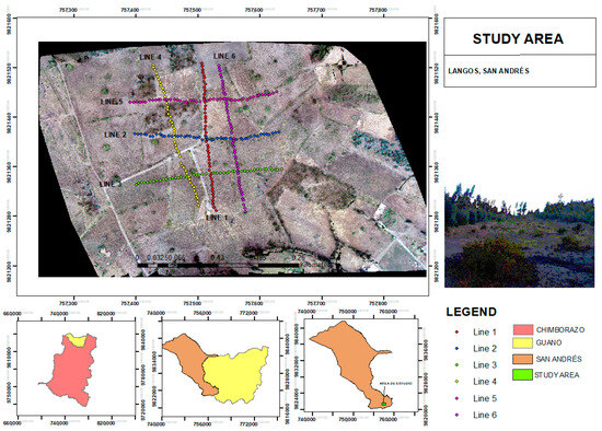 The sector selected for the topographies met the criteria in terms of accessibility and the absence of obstacles. The tomographic lines were performed in a high area of the Langos sector since in this sector there is a water supply tank for consumption in this area, so if in the future the exploitation of groundwater is carried out, it would save on the costs of construction of a storage tank, in addition to the fact that the land belongs to the GAD of Guano.