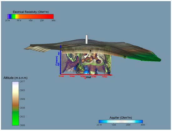 From the data obtained in the topographies, the 3D reconstruction was performed (Figure 4), which revealed in a better way the presence of different lithological materials present in the study area. As shown in the figure, there are areas with low resistivity at depths of up to 50 m. There are also areas where the intrusions of rocks of different sizes have been observed. In addition, it was possible to detect the presence of a possible groundwater zone at a depth of 55 m.