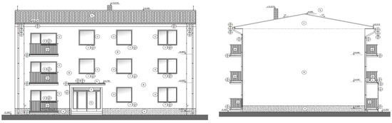 The original residential building (Figure 1) is located in the village Raslavice in northeastern Slovakia. The building is designed as a detached three-story building without a basement, with a gable roof with a slight slope. Residential units are located on each floor. The gross floor area (GFA) is 418.1 m2. A condensing boiler is used for hot water preparation and heating. The energy consumption total for heating is 34.44 kWh/m2. Variant B1 is constructed on strip foundations reinforced with perimeter wreaths, with monolithic ceilings and a staircase. The external walls are made of aerated concrete blocks. In variant B1, the external wall materials have been changed, and two additional alternatives have been created. The external walls of variant B2 are made of sand-lime blocks. The external walls of variant B3 are made of hollow bricks.