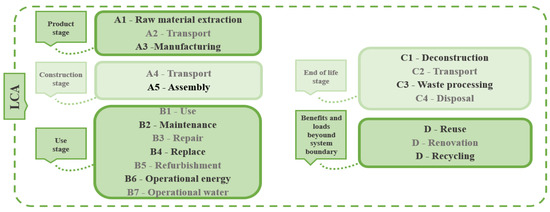 The LCA method has a fixed structure and was carried out according to the international standards ISO 14040 and EN 15978, STN EN 15804+A2+AC and PCR (Product Category Rules) as a supplement to STN EN 15804+A2+AC, which is an additional set of rules for specific product categories. Figure 2 shows the system boundary for LCA. Commercially available databases of processes as well as material and energy flows were used for the efficient processing of this LCA study. The LCA method can be defined as the assemblage and assessment of inputs, outputs and potential environmental impacts of a product system during its life cycle [15].