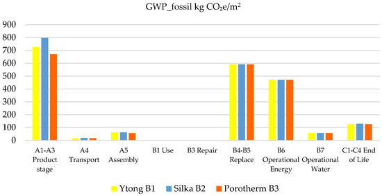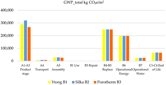 According to the results for the GWP—total, variant B2 achieves the worst result, 8.92 × 105 kg CO2eq, and B3 achieves the best result, 8.35 × 105 kg CO2eq. Figure 3 shows the results for the GWP—total expressed in kg CO2eq emissions per gross floor area (GFA). The GWP—total values expressed per m2 of GFA are 2.06 × 103, 2.13 × 103 and 2.00 × 103 kg CO2eq/m2 for B1, B2 and B3, respectively. Variant B3 has the lowest emission levels, and variant B2 has the highest. The building materials (A1–A3) produce the largest share of CO2eq emissions at 33.71% (2.90 × 105 kg CO2eq) material replacement and refurbishment (B4-B5) produce 28.88% (2.48 × 105 kg CO2eq) and operational energy (B6) produce 22.93% (1.97 × 105 kg CO2eq). The main contributors to emissions are sand-lime bricks (21.2%), aerated concrete blocks (13.1%) and ready-mix concrete (6.3%).