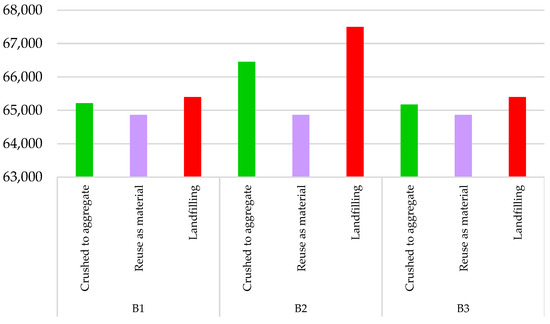 Table 2 shows the end-of-life phase scenarios for the building alternatives B1, B2 and B3. Scenario 1 represents the market scenario that is the most typical in Slovakia. The purpose of Scenario 2 was to set the end-of-life phase so that the impacts are further reduced through reuse. Scenario 3 represents the landfilling of the waste.