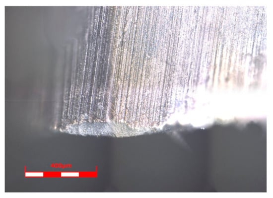 Figure 2 illustrates a microscopic image of the tool after the experimental tests. It can be observed that the edges experienced wear, resulting in a loss of cutting ability and consequently affecting the accuracy of the drilling operation. In addition, the edge showed a slight rounding, making the cutting inefficient and increasing the delamination effect in composite material.