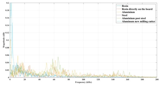 Figure 3 shows the raw (unprocessed) signals in the time domain on the resin, aluminum, and steel supports. As expected, it can be observed that the behavior of AE (acoustic emission) from the milling cutter changed according to the support material. It is noticeable that the amplitudes (in volts) on the steel and aluminum supports were higher than on the resin support, which was expected, as resin, due to its mechanical properties, tends to dampen vibrations (which generate acoustic emissions), which is not the case with steel and aluminum. However, in the time domain, it can be difficult to discern differences between signals from the same support, making frequency domain analysis necessary for studying milling cutter wear.