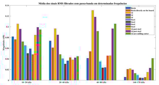 Figure 5, you can see the averages of the bandpass-filtered RMS signals in the chosen frequency ranges. Firstly, the range from 40 to 80 kHz proved to be the most important for the TCM (tool condition monitoring) study, as it showed the highest magnitudes of acoustic emission between passes and supports, as well as greater variations. This allows for the derivation of values that indicate wear, breakage, or fractures in the milling cutter. Additionally, the range from 10 to 20 kHz was also significant, exhibiting considerable amplitude variations, especially for the aluminum support, which varied significantly between passes. Furthermore, the range from 20 to 40 kHz also yielded good results, though it was of lesser importance compared to the other two treated ranges.