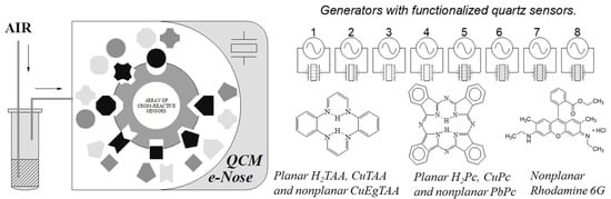 Illustration of the measurement procedure using an “electronic nose”-type system based on quartz microbalance transducers with the sensitive layers of organic molecular crystals.