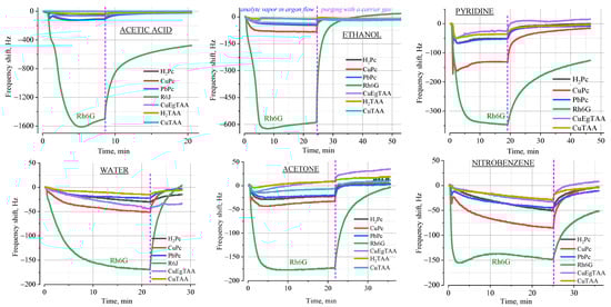 The measurement procedure included (i) the stabilization of the baseline in an argon flow (frequency deviation: +/−2 Hz), (ii) an exposure to a gas sample of analyte vapor in carrier gas (10–25 min) under the constant flow rate, and (iii) subsequent purging with a carrier gas. To minimize the influence of previous experiments, a break of at least 4–5 h was taken between individual experiments, during which the sensor array was in an atmosphere of dried argon.