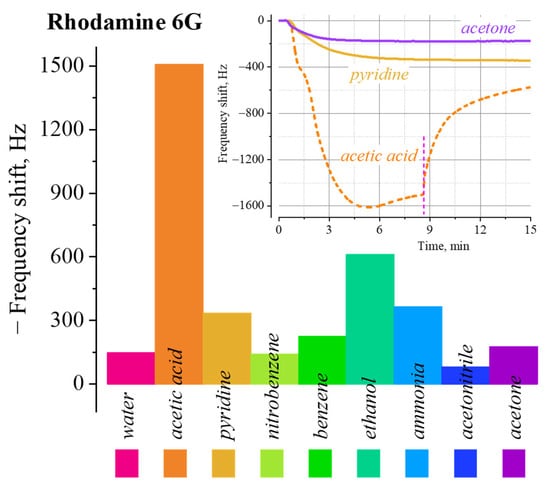 The response of sensors coated by Rhodamine 6G shows that the adsorption of all analytes is characterized by monotonic dependences when reaching a saturation level. The magnitude of the frequency shift is determined by the nature of the analyte (Figure 5). As can be seen from the figure, this coating has the greatest adsorption capacity for acetic acid and ethyl alcohol and the smallest adsorption capacity for acetonitrile, acetone, and nitrobenzene. The rather small response to water (about 200 Hz), in which Rh6G is highly soluble, is apparently due to the short exposure time. Indeed, as can be seen from Figure 4, the adsorption process did not reach a steady state, suggesting a higher adsorption capacity. Moreover, as already observed, in such cases, there are changes in the morphology of the coating and, as a consequence, changes in the selectivity profile of the sensor element. Thus, such sensors are unsuitable for practical use.