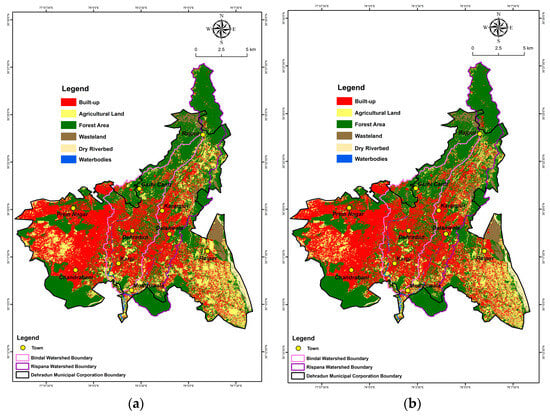 The world is moving toward a freshwater crisis which affects river systems and their surrounding environments [1]. Urbanization, climate change, the over-exploitation of natural resources, and an increasing population pose a threat to the ecosystem services and biodiversity of freshwater resources [2,3]. With increasing land development and human activities in nearby and distant watersheds, the supplies of drinking water for cities are stressed due to potential contamination. India’s 35% urban population generates almost 65% of the country’s wastewater [4]. Urban river management in India is crucial for controlling the effects of growing anthropogenic pressure on the river system [5]. Urban river management refers to the comprehensive planning, development, and sustainable utilization of river resources within urban areas. The maintenance and restoration of these resources are essential elements of effective urban river management. This may include maintaining water quality, managing river flow, taking steps to prevent flooding, reviving riverfront areas for recreation and biodiversity, and making sure adequate sanitation and wastewater treatment. The roles of digital elevation models (DEMs) and multispectral sensor-based geospatial techniques are significant for urban river management studies. Earlier geospatial techniques are tedious, expensive, and more error-prone than the latest geospatial techniques. Spatial and temporal analyses of an area will provide us with a comprehensive view of the topography and changes in the land use pattern of an area [6]. In this study, we evaluate the land use changes and topographical factors of the Dehradun Municipal Corporation (DMC) and its associated watersheds. This study’s main concern is the impact of humans on nearby river systems. Urban planners and water resource managers who are involved in urban river management and sustainable development will benefit from the findings of this study.
