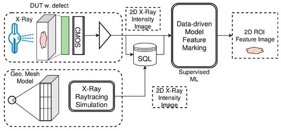 It is desirable to detect or mark defects, damages, or impurities using an automated feature marking system directly in the measure images. The impact of image quality can be relevant to the feature detection quality, regardless of the complexity of the model behind []. Often, complex neural networks (deep learning models) are used []. In this work, a simple pixel classifier is used. Semantic pixel detectors are simple mathematical models that can be used to mark Regions of Interest (ROIs) in an image relating to a specific semantic class. After the image preprocessing and filtering stages, damage and material faults are identified by a pixel anomaly detector, basically an advanced Convolutional Neural Network (CNN) and region proposal R-CNN models. Training pixel classifiers can require the use of only a few images because each pixel region is a sample instance. R-CNN models require an extended sample data base which cannot be acquired only by physical measurements. The training and test data set will always be limited by a limited number of specimens, e.g., with impact damages, and a limited variance in material and damage parameters (e.g., location). For this reason, the data set is extended by synthetic data augmentation using X-ray simulation. In contrast to other wave measurement principles like Guided Ultrasonic Waves (GUWs), X-ray images can be simulated with high accuracy (compared with physically measured images). We are using the gVirtualXray software library [,] and performing X-ray image simulation by using GPU processing only and ray tracing. gVirtualXray is proven in terms of its suitability to produce accurate images as long as the diffraction and reflection of X-rays are neglected. In addition, a novel few projection hidden-damage detection methodology is introduced that can be used in-field with a portable X-ray machine as described above. Preliminary results show a high defect detection rate for a wide range of materials.