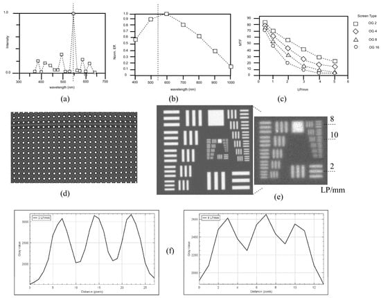 (a) Emission spectrum of the scintillator material []. (b) Spectral sensitivity of the Sony IMX290 image sensor []. (c) Resolution of the scintillator screen independent of the material thickness and amplification factor [] (OG-2: conversion factor 100, OG-4: 200, and so on). (d) Dot pattern measured using the LowQ X-ray detector. (e) USAF 1951 pattern recorded with 55 kV/0.7 mA/average of four images. (f) Intensity profiles and contrast at 2 an 8 LP/mm from (e).