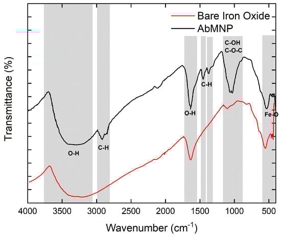 Figure 1 shows the FTIR transmittance spectra of the as-prepared IONP and the AbMNP. The transmittance spectra within the 4000–400 cm−1 range were recorded for the samples. The wide band gap from 3700 to 3000 cm−1 and peak at 1645 cm−1 is attributed to the stretching vibration of –OH groups on the surface of the particles. The peak at 2937 cm−1 corresponds to the –CH bond of CH2 bending. The peaks at 1455 cm−1 and 1366 cm−1 represent the symmetric –CH3 deformation of chitosan. The peaks at 569 cm−1 and 459 cm−1 are typical of Fe–O that correspond to the vibrations of tetrahedral Fe–O and octahedral Fe–O bonds. The band at 1070 cm−1 is attributed to the C–OH and C–O–C vibrations of the chitosan ring.