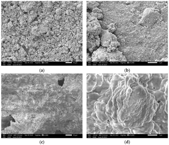 The structural morphology of the IONP was investigated by scanning electron microscopy (SEM). Figure 2 depicts the surface images of the particles. Figure 2a,b shows the as-prepared IONP consisting of agglomerated nanoparticles. Figure 2c,d showed that the nanoparticles are coated with chitosan molecules, as shown with smoother lumps.