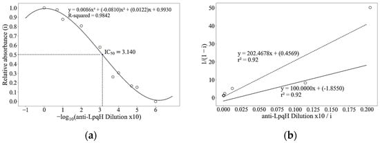 (a) Plot of relative absorbance, vs. , data obtained through ELISA. (b) The parameters of the linearized curve are shown following the method []. The corrected slope is = 100.00, upon using IC50 compute for the corrected y-intercept (−1.8550), which was used as linear regression constraint (Pearson correlation = 0.92).