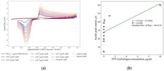 (a) Voltammograms of TB lipoprotein LpqH antigen precursor detection using AbMNP as bioreceptor, measured using 50 mV/s scan rate and screen-printed carbon electrode. (b) The plot of the anodic peak current with error bars and linearized curve for estimating the limit of detection.