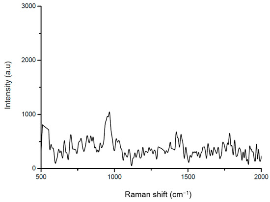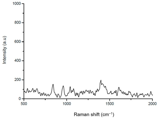 To compare the SERS performance of two commercial SERS substrates, Q-SERSTM and RAM-SERS-AU, by using Aspirin C as a representative molecule, the Raman spectrum of Aspirin C was obtained by analysing Aspirin C on a metal disc. A representative Raman spectrum is shown in Figure 1. In the quite noisy spectrum, some of the peaks of acetylsalicylic acid that are observed are visible at 1603 cm−1 and 1030 cm−1 [9,10], associated with the vibration of the carbonyl group and the presence of the aromatic ring, respectively. Weak signals of aspirin are visible in the region around 840 cm−1 (associated with out-of-plane bending C-H), 900 cm−1 and 1419 cm−1. As far as ascorbic acid is concerned, a band around 960–980 cm−1 associated with the C-H and O-H bending is visible [11].