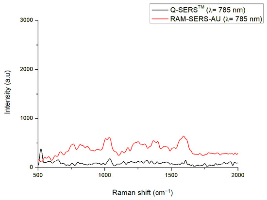 SERS spectra of Aspirin C on Q-SERSTM (black line) and RAM-SERS-AU (red line) substrates by using excitation with a 785 nm laser and optical objective 50x.