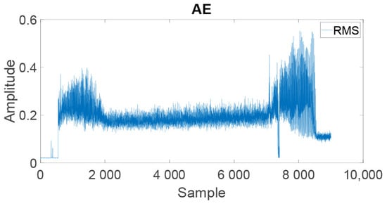 Each case has a unique number of passes in the tool on the workpiece; this variable is called run. The duration of each case is represented by the variable time. Finally, the sensor variables are the root mean square (RMS) values collected in around 9000 samples. Only two of these are used, namely the vibration signals from the variable vib_table and AE from the variable AE_table. Typical raw AE signal values are shown in Figure 1.