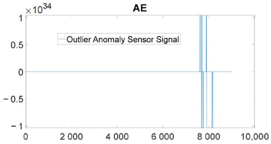 The vib_table and AE_table sensor variables were split into statistical variables, specifically the mean, variance, skewness, and kurtosis for each signal. A simple analysis of the mean values of the statistics highlighted an anomaly in the mean and variance values, leading to a huge difference between the values. The outlier sample value was highlighted (Figure 2); it appears that the signal was corrupted and, consequently, removed from all tables, resulting in much more realistic values. The statistical values replaced the signal values with 8 new variables, specifically, m_AE, m_vib, v_AE, v_vib, s_AE, s_vib, k_AE and k_vib. Each variable’s name represents a combination of the first letter of the mean, variance, skewness or kurtosis, and AE or vibration specifying the statistical value and sensor. The resulting table had 145 samples and 13 scalar variables.