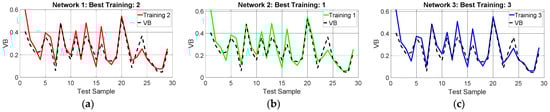 The plots in Figure 3a–c coincide with the smallest MAPE, all resulting from one of the training sessions (T1, T2, or T3) for each network compiled in Table 2. The output values are very close to the desired values, represented by a black dotted line, but there was no VB result greater than 0.5, contributing to a higher MAPE value. All the networks failed on the first sample. One solution would be to obtain more training data with high values (above 0.5) to balance the distribution, or to even have a better method for separating training and test sets, such as the k-partition cross-validation method, the aim of which would be to evaluate each network topology on different training and test subsets with a specific size (k) []. The best results were close to 24% MAPE and 0.43 variance in Network 3.