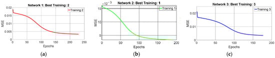Best training convergence in (a) Network 1; (b) Network 2; (c) Network 3.