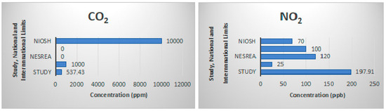 The results (Table 1) reveal CO2 concentrations of 537.48 ± 46.91 ppm, which are lower than the results (856.9 ± 400 and 987 ± 400 ppm) reported by Obisesan and Weli [6], 10,000 ppm NIOSH [7] and 1000 ppm WHO [8] (Figure 1). Though the figures might vary slightly depending on measurement methods and locations, this value aligns with the overall upward trend observed in recent decades. A comparative analysis of these studies provides a comprehensive view of how CO2 concentrations have changed over time and across regions. NO2 and O3 concentrations vary thus: 197.91 ± 34.93 ppb, 2.03 (skewness), 2.61 (kurtosis) and 0.16 ± 14.72 ppb, −1.55 (skewness), 0.83 (kurtosis). The PM1, PM2.5, and PM10 levels were measured at 9.59 µg/m3, 14.14 µg/m3, and 15.09 µg/m3, respectively, indicating a gradual increase in particle size. The PM2.5 and PM10 concentrations are higher, reflecting their greater prevalence and potential health risks. A temperature of 32.76 °C can impact particle dynamics. Warmer temperatures may enhance atmospheric turbulence, leading to particle dispersion and dilution, potentially lowering PM concentrations [9]. With a relative humidity of 58.50%, particles could experience hygroscopic growth, causing them to absorb water and become larger. Higher RH might also aid in particle settling, potentially contributing to lower airborne PM levels. Understanding the intricate interplay between PM sizes, temperature, and relative humidity is crucial for accurate air quality assessments and effective pollution management strategies [10].
