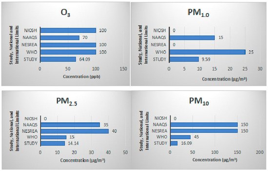 Figure 1 shows the NO2 concentration of 197.91 ppb and contrasts it with daily international guidelines set by NIOSH, NAAQS, NESERA, and the WHO. The observed NO2 concentration surpasses the 70 ppb [7], 100 ppb [11], 120 NESERA [12] 120 ppb, and 25 ppb WHO [8] limits. This discrepancy is attributed to excessive NO2 emission due to heavy vehicular movement within the study area. Effective pollution control measures and collaborative efforts are essential to curb NO2 levels and ensure a healthier and cleaner environment. The recorded O3 concentration falls below NIOSH’s 100 ppb, NAAQS’s 70 ppb, NESERA’s 100 ppb, and the WHO’s 100 ppb limits. While it adheres to most standards, its proximity to these thresholds necessitates vigilant monitoring. Ozone at elevated levels can exacerbate respiratory conditions and harm vegetation. While the observed concentration meets many standards, the closeness to limit values still implies potential health and ecological risks. The impacts of this pollutant can lead to complex health outcomes. The PM1.0 concentration of 9.59 µg/m3 falling below international standards is due to the low volume of vehicular and human activities because the institution is not in session. Maintaining this trend requires efforts to minimize emissions, improve air quality, and safeguard both human health and the environment. The recorded PM2.5 concentration is below NAAQS’s 35 µg/m3, and NESERA’s 40 µg/m3, but comparable to the WHO’s 15 µg/m3 standard. The differences in standards emphasize the need for harmonization and stringent measures to curb PM2.5 pollution. The recorded PM10 concentration is below NAAQS’s 150 µg/m3, NESERA’s 150 µg/m3, and the WHO’s 45 µg/m3 standards. The reasons for these differences could be due to the location of the monitoring station, meteorological parameters, time of day (especially rush hour), and season [13]. Also, the temperature and humidity did not have much effect due to the presence of standing and ceiling fans working and window ventilation.
