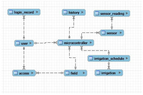 In the diagram depicted in Figure 1, the “user” table holds information about the system maintainers. This table exhibits a one-to-many (1:N) relationship with the “microcontroller” table, signifying that a single user can register multiple microcontrollers, while each microcontroller can be registered by only one user. Additionally, the “user” table maintains one-to-many (1:N) relationships with two other tables, the “login_record,” which stores user log entries, and “access,” which records the agricultural fields that a user is authorized to manage.