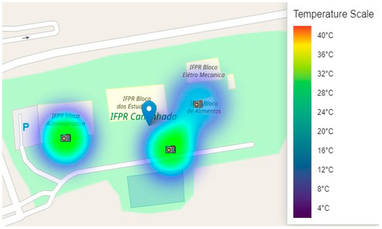 Figure 3 illustrates a temperature map generated using the data collected by three microcontrollers on 29 August 2023. The microcontroller positioned outside the “IFPR Bloco Administrativo” recorded an average temperature of 28.4 °C during the one-hour interval when the map was generated. The one located underneath the “IFPR Bloco dos Estudantes” registered 28.8 °C, while the microcontroller inside the “IFPR Bloco de Alimentos” measured 21.8 °C. The system calculates an average of the values recorded within a specific time frame and performs data interpolation. The users can explore different positions by interacting with the map by clicking and dragging on the screen. To obtain temperature readings, they simply click on the microcontroller icons. The initial position has been set to the location of IFPR—Campus Jacarezinho.