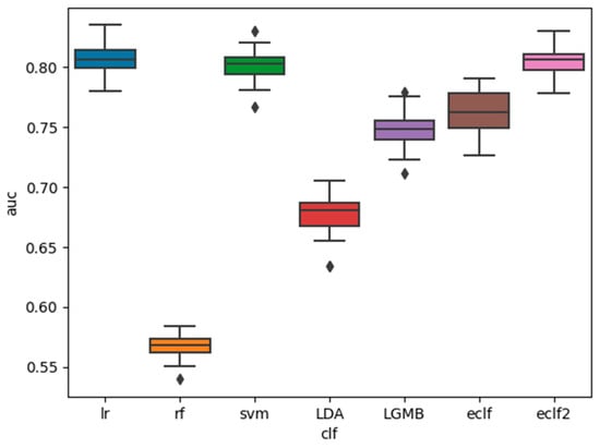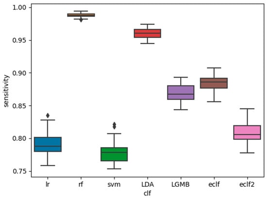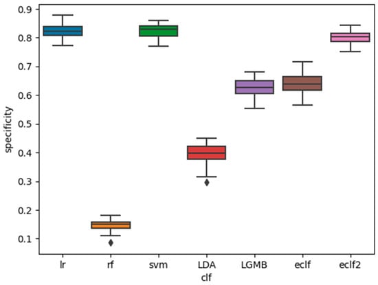 The AUC, sensitivity, and specificity of the base classifiers and the ensemble classifiers are shown in Figure 1, Figure 2 and Figure 3. It is shown that among the five base classifiers, LR achieved the highest AUC and specificity. RF had the highest sensitivity but the lowest specificity, which translated to the lowest AUC among all base classifiers. Compared to ECLF, ECLF2 had similar AUC to LR but a better trade-off between sensitivity and specificity.
