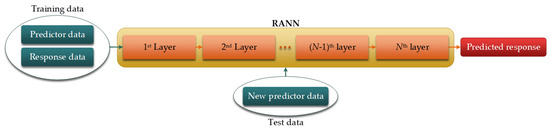 A RANN is an ANN specifically tailored for regression problems. It is a feedforward, fully connected neural network showing the standard input layer, a number of hidden fully connected layers, and the output layer. The network input is defined as the predictor data. Each fully connected layer handles the input data by means of a weight matrix and a bias vector; an activation function (e.g., the rectified linear unit, hyperbolic tangent, sigmoid function, and linear function) can provide nonlinear transformations of the information/data, see [24,25,26]. A backpropagation algorithm is adopted to tune the weights of the RANN, managing a loss function (as a prediction error between the input and the output) to be minimized with the stochastic gradient descent algorithm. Finally, the predicted response is given as the network output. Figure 1 shows a graphical representation of the RANN, wherein N denotes the number of fully connected (hidden) layers.