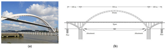 The Lupu Bridge is a steel arch bridge crossing the Huangpu River in Shanghai as shown in Figure 2. It has a total length of 750 m, comprising a main span of 550 m and two side spans of 100 m. Figure 2b provides the elevation view of the Lupu bridge as well as its main sizes. The girder in the side span is a closed steel box, with a width of 41 m and a height of 2.7 m [30].