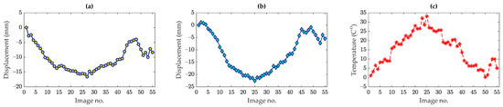 A long-term SHM program of the bridge was carried out by Qin et al. [30] with the aid of spaceborne remote sensing to inspect the variability in the displacement response of the bridge dome and main span. Fifty-five SAR images from TerraSar-X were collected to extract the displacements of the mentioned bridge components. During the monitoring period, the air temperature was also recorded to incorporate seasonal and thermal effects in the SHM program. Figure 3 illustrates the collected displacement and temperature data. From the regression viewpoint, the displacement and temperature samples are the main dependent (response or output) and independent (predictor or input) data, respectively.