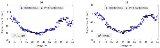 Prediction of the displacement response by the proposed RANN-BHO method: (a) dome, and (b) main span.