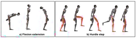 Flexion–extension range of movement and hurdle step tests for spine motion according to the protocol in [] were provided by the Xsens software (Figure 1).