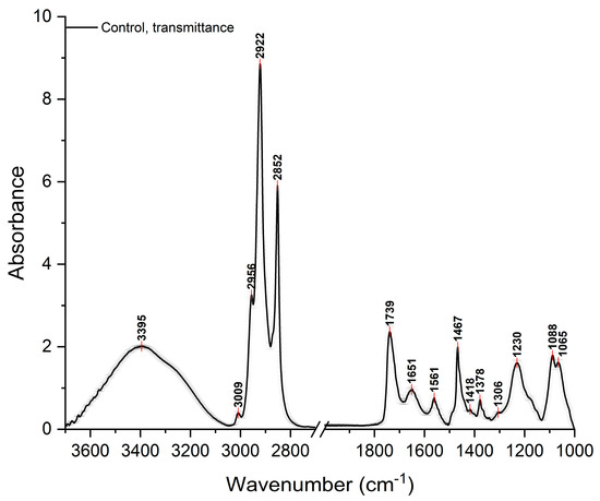 Average FT-IR spectrum obtained in transmittance mode from the average spectra relative to repeated measurements on lipids extracted from HepG2 cells. Data are presented as mean ± SEM. The peaks are shown, and the assignments are made by referring to texts in the literature (Table 1) [5,6,7].