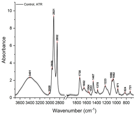 Average FT-IR spectrum obtained in ATR mode from the average spectra relative to repeated measurements of lipids extracted from HepG2 cells. Data are presented as mean ± SEM. The peaks are shown, and the assignments are made by referring to texts in the literature (Table 1) [5,6,7].