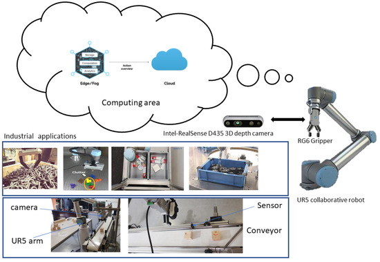 This section provides an overview of the overall application system, as depicted in Figure 1. The intelligent grasping system comprises three principal components: a robotic arm equipped with an integrated two-finger gripper for item manipulation, an RGB-D camera affixed to the arm for data acquisition, and an industrial conveyor belt for the transportation of manufactured items. The central element of this developed application is the collaborative UR5 robot. Due to its inherent capabilities, this robot serves as an asset for assisting human operators in assembly or inspection tasks. It possesses a 6-degree-of-freedom (6-DOF) configuration, accompanied by a control box and a user-friendly programming interface tailored for light assembly duties and automated workbench scenarios. Additionally, it is equipped with a two-finger gripper capable of handling objects weighing up to 5 kg, featuring a total pivotal motion range of 360 degrees. The RGB-D camera in this context fulfills a dual purpose. RGB images are utilized as data inputs, subject to processing within the processing units, aimed at feature extraction and the classification of regions of interest (ROIs) for the detection of any defective areas. Simultaneously, the depth component, utilizing grayscale annotations, serves to estimate pose points for coordinating the 6D robot arm’s position. On the depth image, the X, Y, and Z coordinates are delineated on the corresponding side of the ROI. Depth information is derived from RGB images, enhancing pose estimation capabilities. To optimize system efficiency and practicality, we place a significant emphasis on decentralizing processing units, relocating the processing tasks to Edge units to enhance the localization and recognition of monitored data. Specifically, the proposed YOLOv5 model is designed to facilitate real-time data processing in the Edge unit, thereby improving the system’s overall performance.