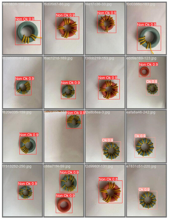To investigate the performance of the YOLOv5 model for our application, we collected a custom dataset comprising both defective and non-defective coils. This dataset was categorized into two distinct classes. Seventy percent of the data was allocated for training, while the remaining 30% was designated for testing. To be precise, the dataset comprises a total of approximately 1294 images, encompassing both “OK” and “Non-OK” pieces. These images were acquired using an RGB camera, capturing the object under study, primarily a metal part, from various angles. Additionally, the influence of lighting conditions on image quality and object characteristics was considered. We conducted image capturing under five different lighting setups: one from the top and four from different positions, each focusing on centralizing the object. To accommodate the input requirements of the deep learning model, we adjusted the image size during the training process. It is important to note that, to mimic real-world conveyor applications, the distance between the camera and the pieces varied along the vertical axis in the captured images. For the generation of the dataset, we classified the data into two classes: non-defective coils and defective ones. The definition of an ideal piece for production involves a green spool with 12 yellow coils. Consequently, any deviation from these specifications is categorized as a defective piece. Defective pieces are identified if they contain either more or fewer than 12 coils, or if the coils and spools exhibit different colors. Our simulation and testing procedures commenced with the training of the network, initially using a learning rate of 0.001 for 100 epochs. Subsequently, we continued training for an additional 40 epochs with a reduced learning rate of 0.0001. In Figure 3, we present sample images of faulty coils (Non-Ok) and non-defective coils (Ok) from our training and test dataset used in our simulation. These images serve to highlight the uniqueness and distinct characteristics of each piece within our dataset.
